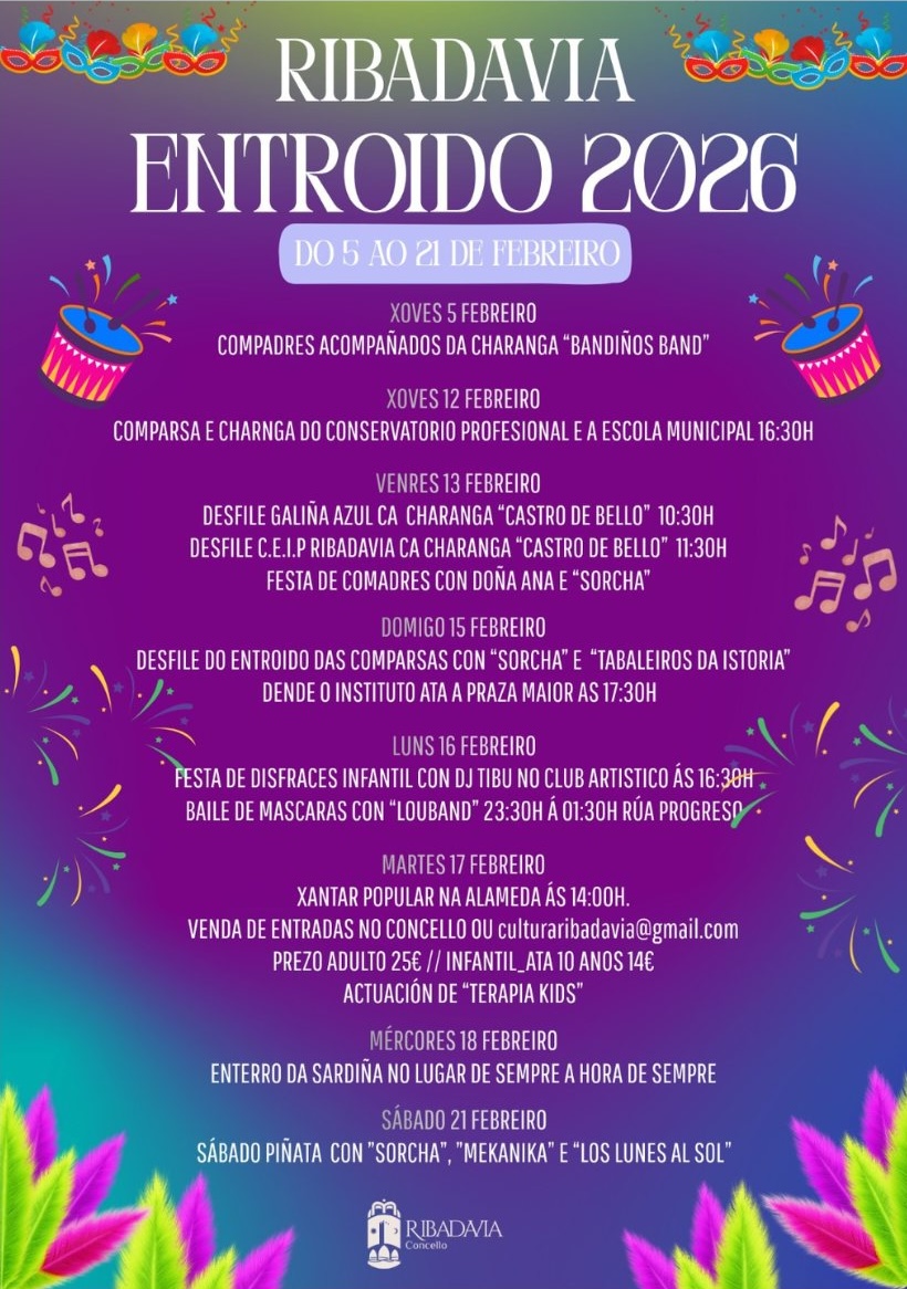 El Entroido 2025 de Ribadavia se celebrará del 5 de febrero al 17 febrero, dando un ambiente festivo, colorido y lleno de alegría. Durante estos días, Ribadavia se convierte en el escenario perfecto para disfrutar de un carnaval con una programación variada y pensada para todos los públicos. Los desfiles, charangas y disfraces serán los grandes protagonistas. Además, no nos podemos olvidar las actividades para los más pequeños y los eventos dirigidos a quienes desean saborear la música y la gastronomía local.